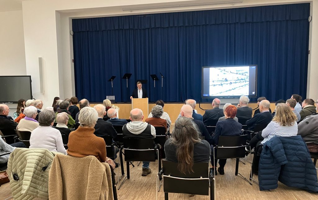 Im Mittelpunkt der Veranstaltung stand der Vortrag von Dr. Knut Langewand, Leiter des Kreisarchivs Warendorf. Unter dem Titel „Neuanfang. Jüdische Rückkehr und Ansiedlung nach 1945“ schilderte er eindrücklich die Herausforderungen, denen jüdische Überlebende nach ihrer Rückkehr in die Region begegneten. Dr. Langewand machte deutlich, dass der Begriff „Neuanfang“ für die meisten Überlebenden eine Illusion blieb: „Neuanfang – allein das Wort ist schon problematisch in diesem Zusammenhang, denn für keinen derjenigen Jüdinnen und Juden, die 1945 oder danach zurückkamen, gab es eine Stunde Null.“ Viele kehrten in zerstöte oder enteignete Häuser zurück, mussten materielle Not und Unsicherheit bewältigen und lebten oft Tür an Tür mit ehemaligen Tätern oder Mitläufern. Anhand bewegender Einzel-schicksale, wie der Familien Riebak aus Ahlen und Mundinger aus Telgte sowie des in Warendorf beheimateten späteren Präsidenten des Zentralrats der Juden, Paul Spiegel, wurde deutlich, wie schwierig und oft schmerzhaft der Weg zurück in ein normales Leben war. Dr. Langewand betonte, dass die Rückkehrer sowohl mit den Folgen der Verfolgung und dem Verlust ihrer Angehörigen zu kämpfen hatten, als auch mit einer Gesellschaft, die sich erst langsam ihrer Verantwortung stellte.